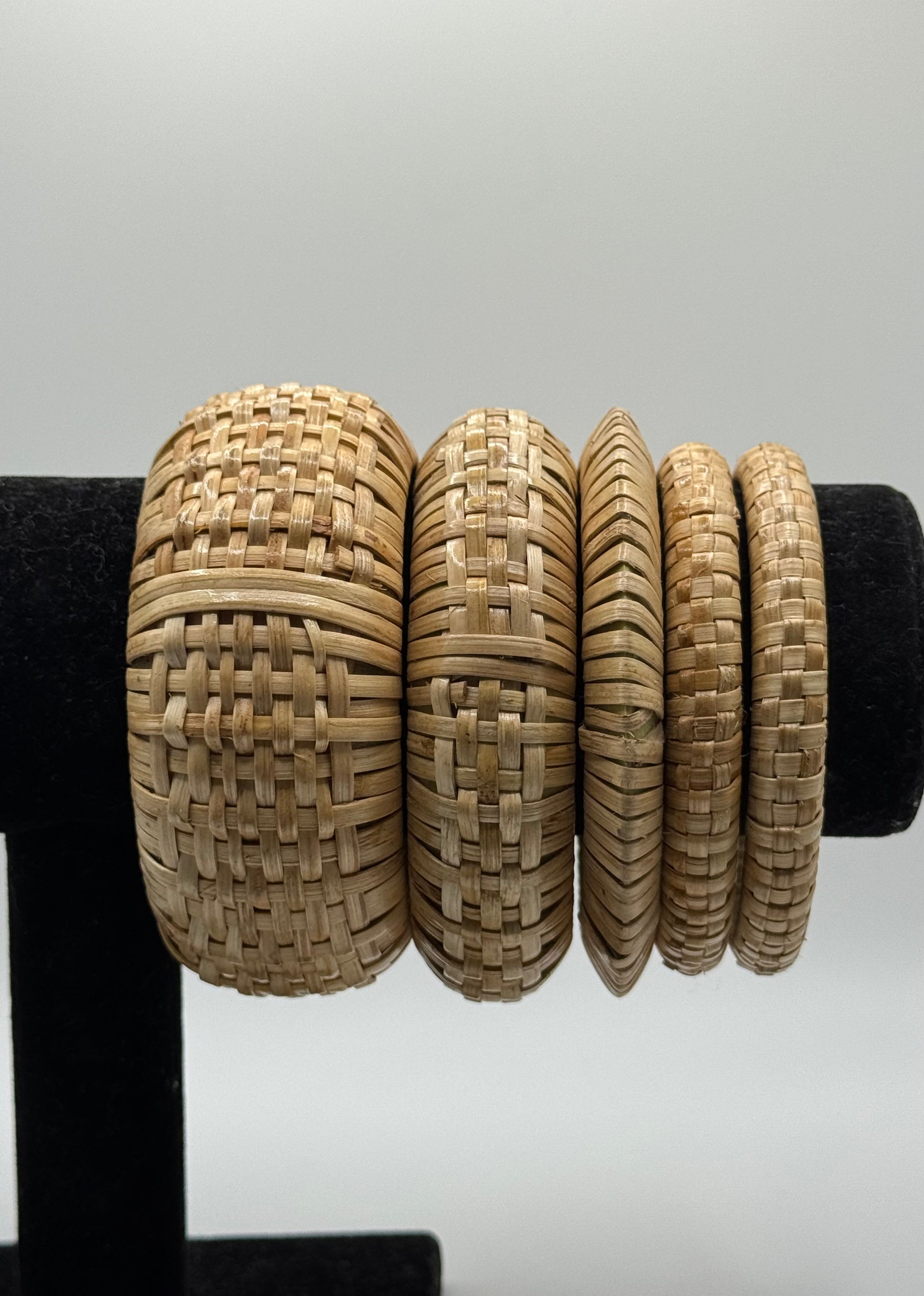 Each bracelet has a sturdy internal frame made of wood or plastic and is carefully woven from cane dyed in earthy and contemporary hues, forming intricate patterns and rhythmic textures.