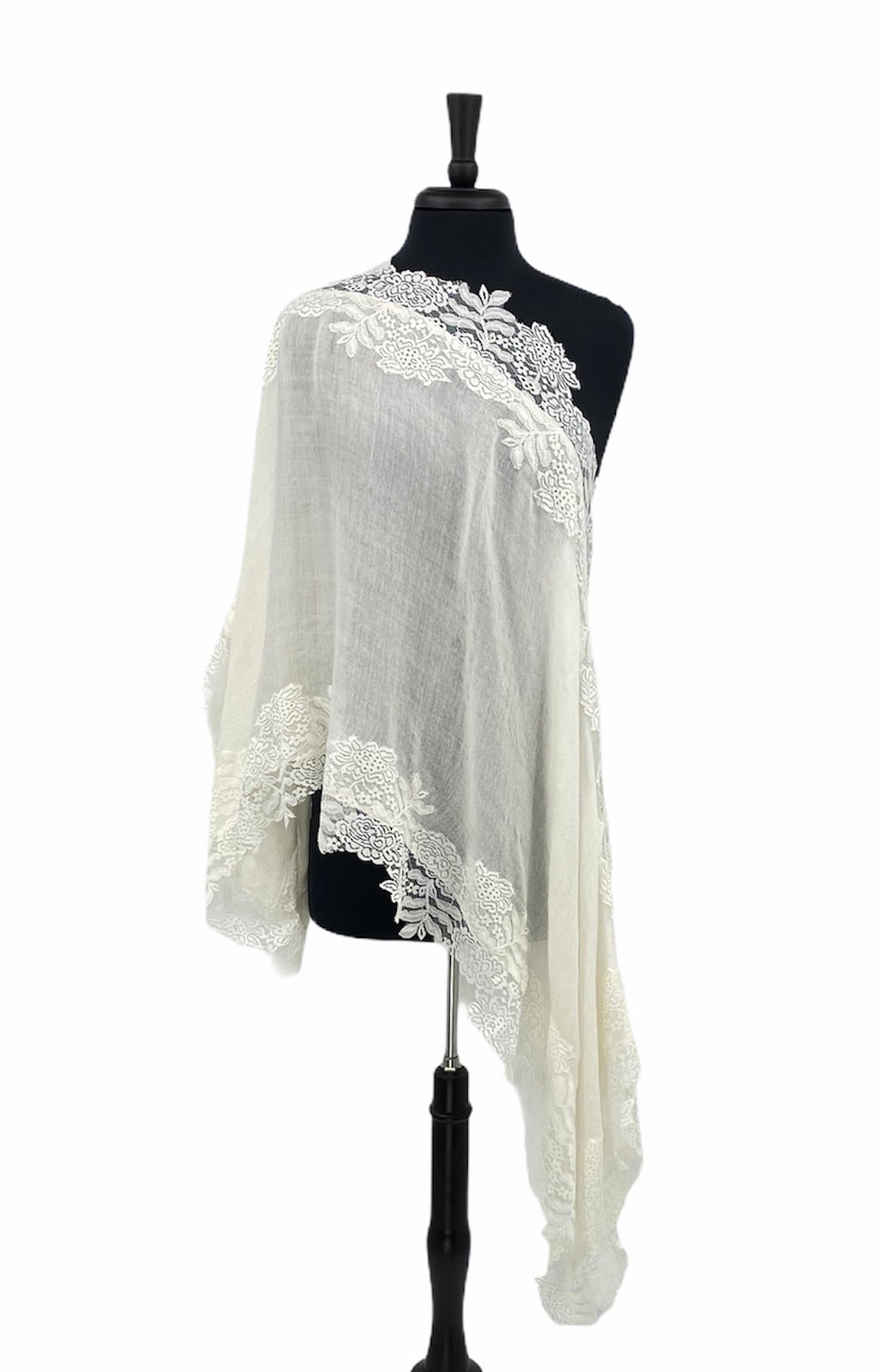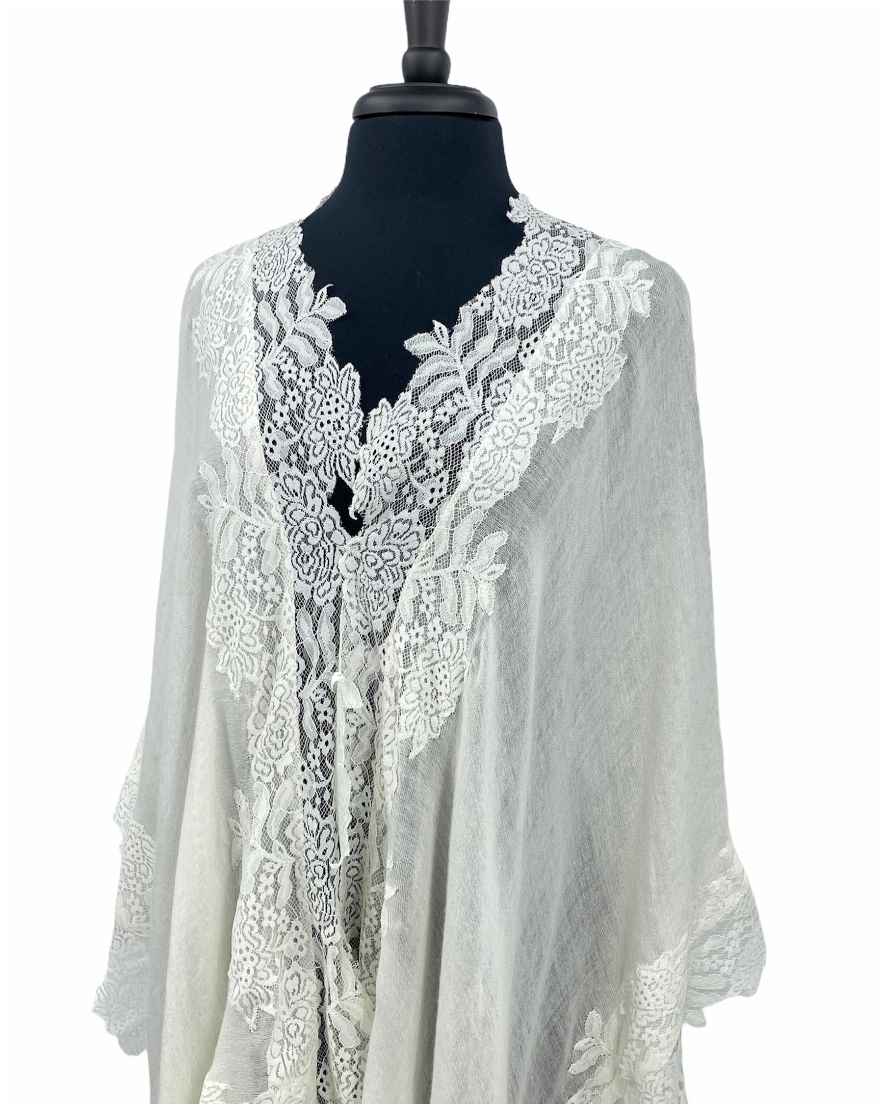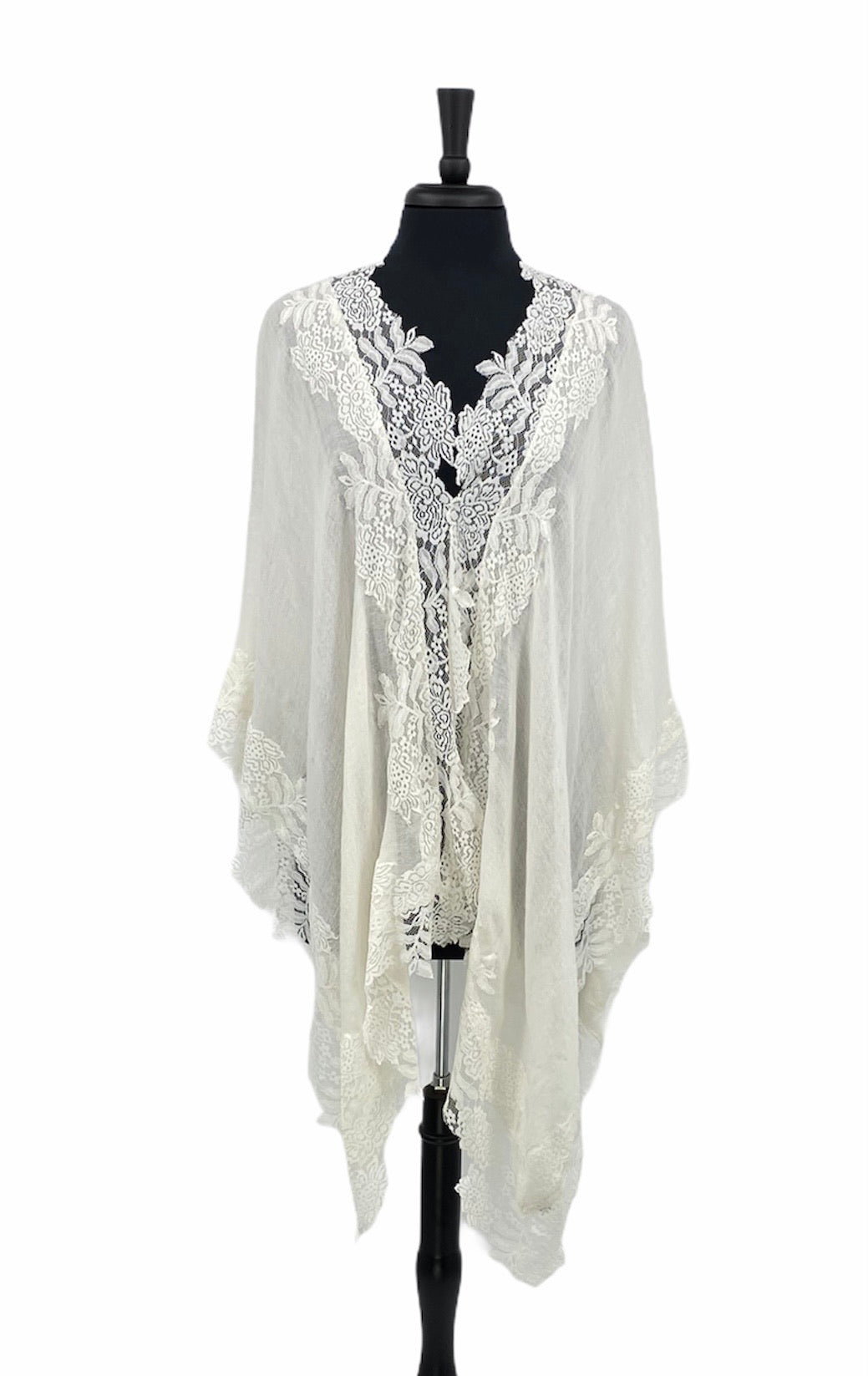 This poncho is an exclusive Yady design, embrace your elegancy with this unique piece. The cashmere fabric blend is the base for the pattern in Australian lace. This poncho is offered in one size. You can wear three different ways.