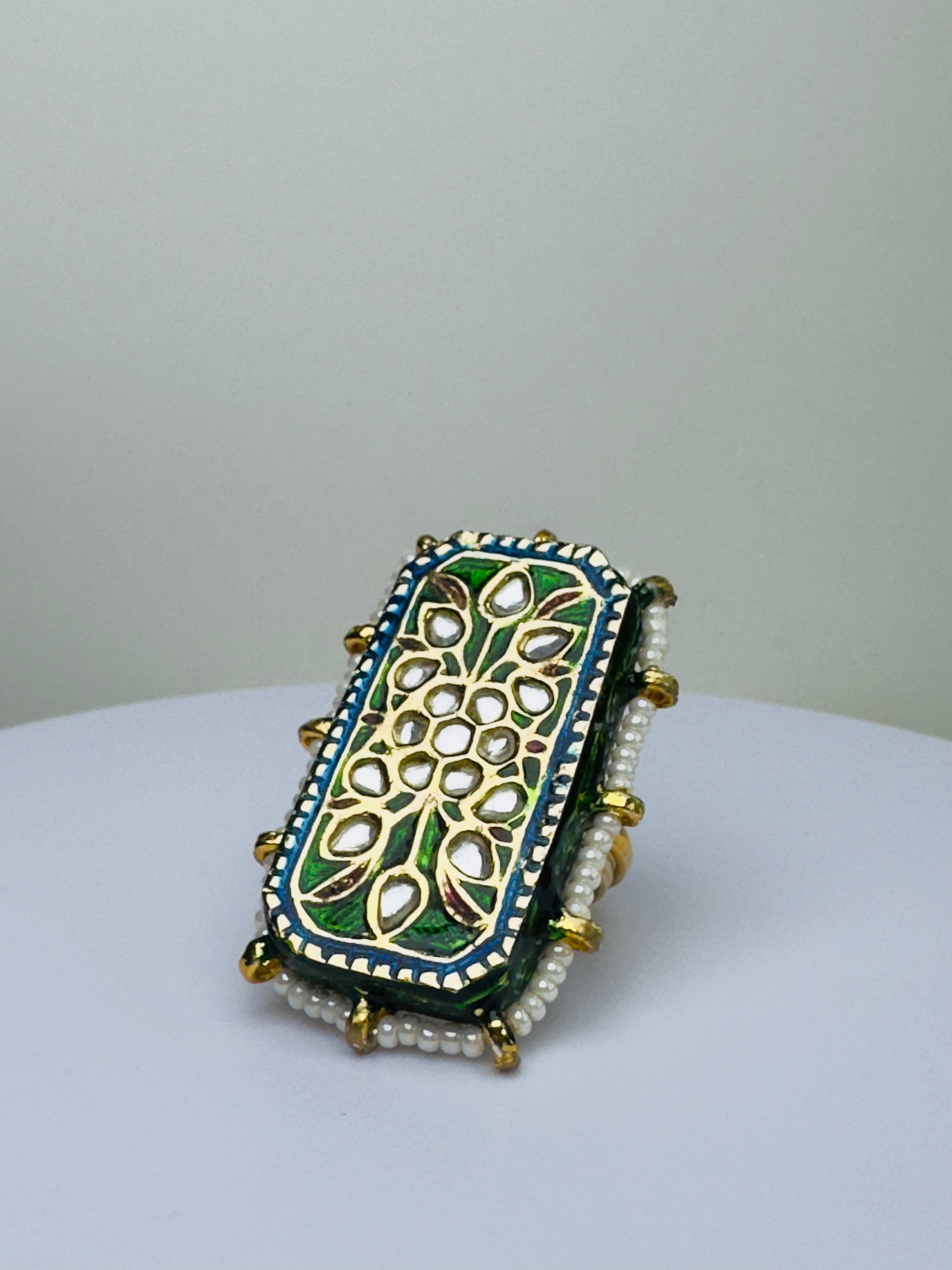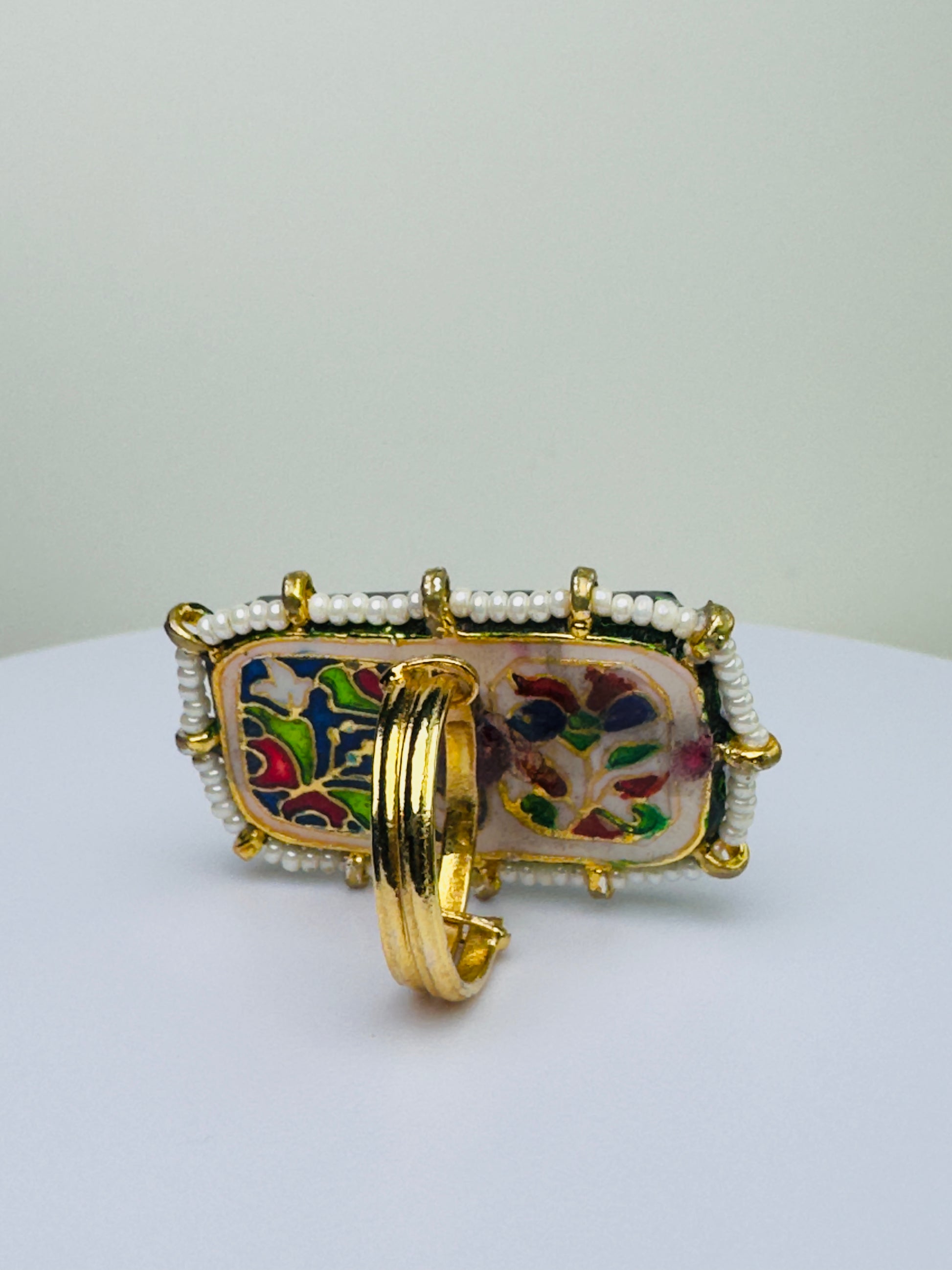 Gold Kundan Enameling Work Ring Statement. 1.5" length x 1" width. Handcraft meenakari. The ring is 22K gold plated and adjustable. Fits all sizes.