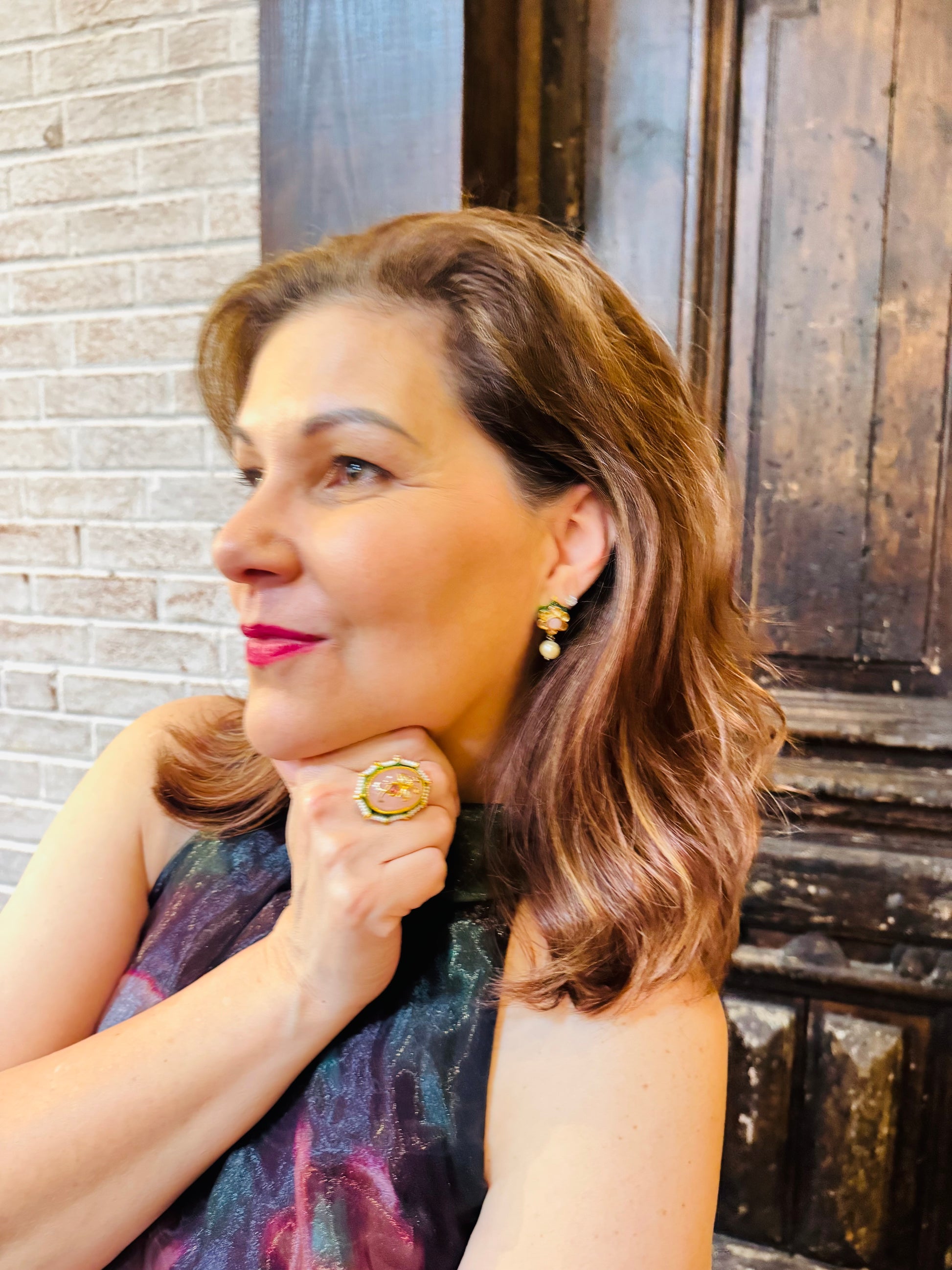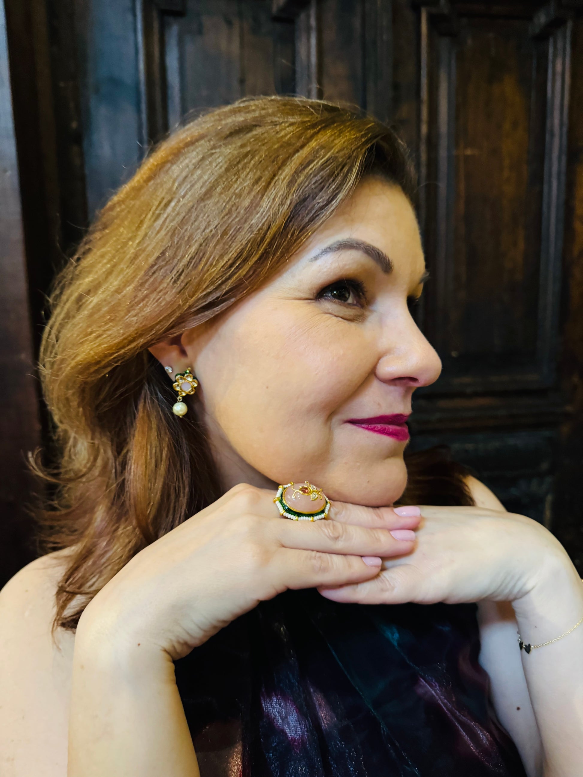 Gold Kundan Quartz rose stone with pearls. 1.25" length x .75" width.The ring is 22K gold plated and adjustable. Fits all sizes.