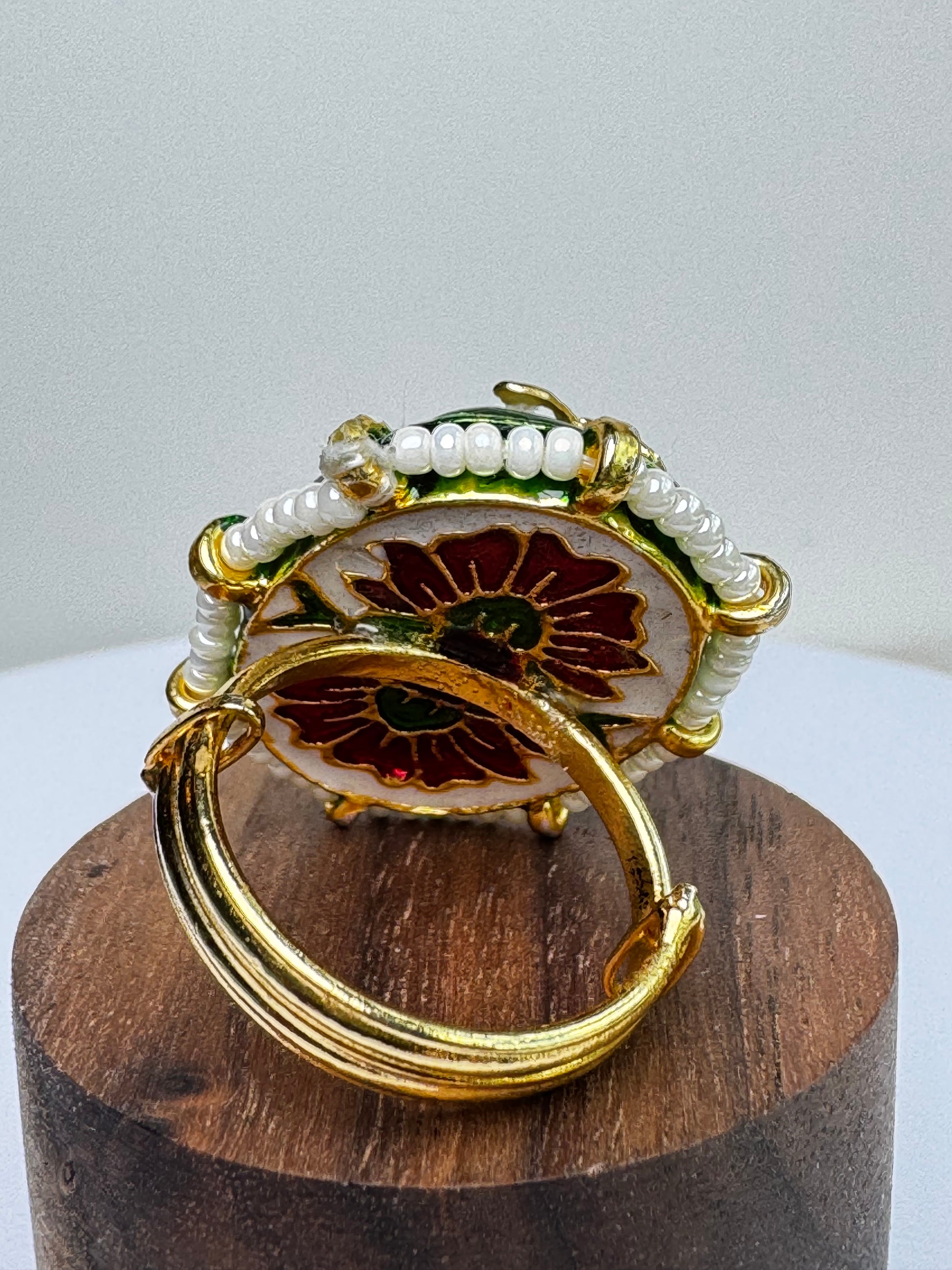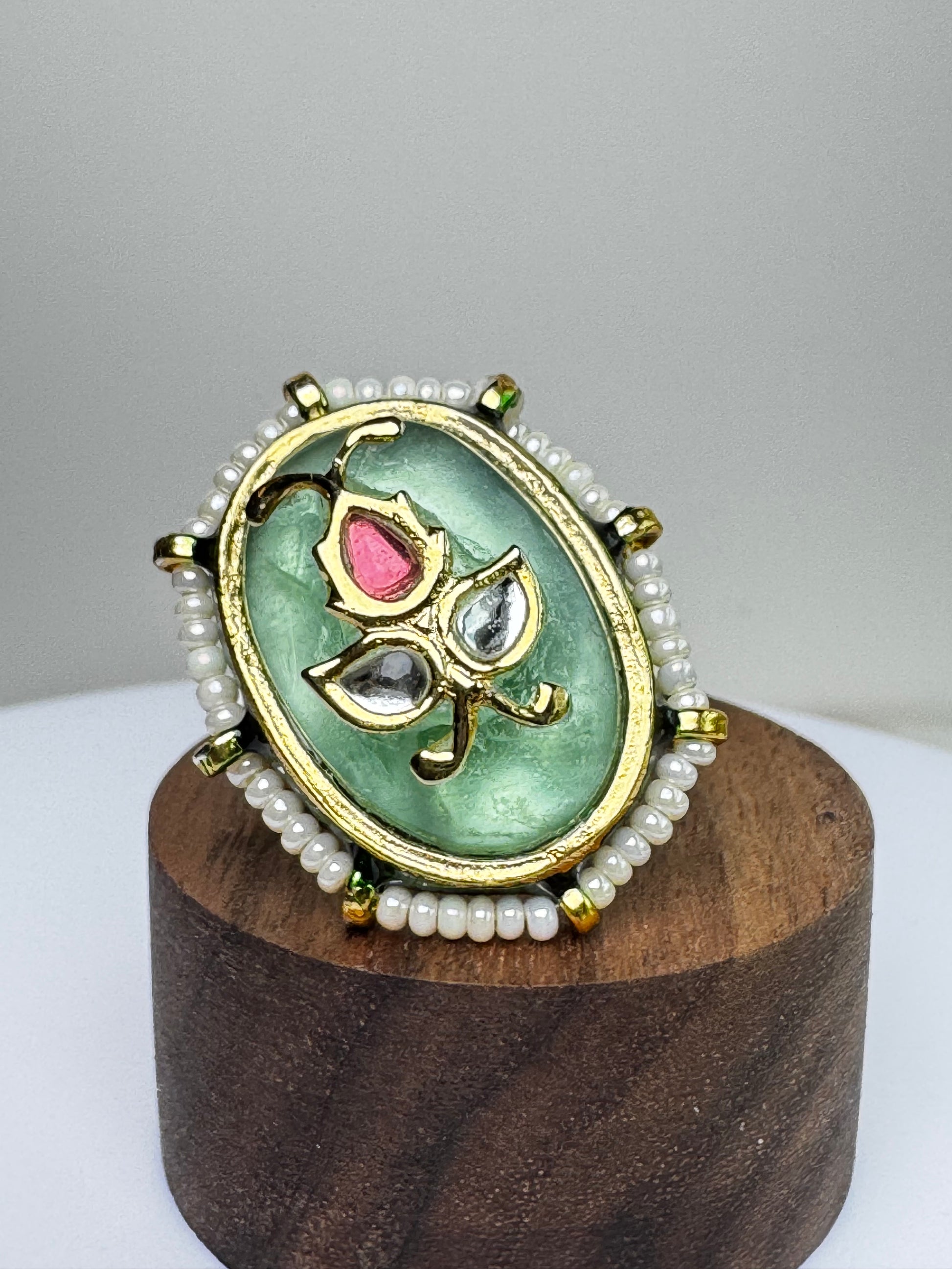 Gold Kundan Fluorite stone with pearls. 1.25" length x .75" width. The ring is 22K gold plated and adjustable. Fits all sizes.
